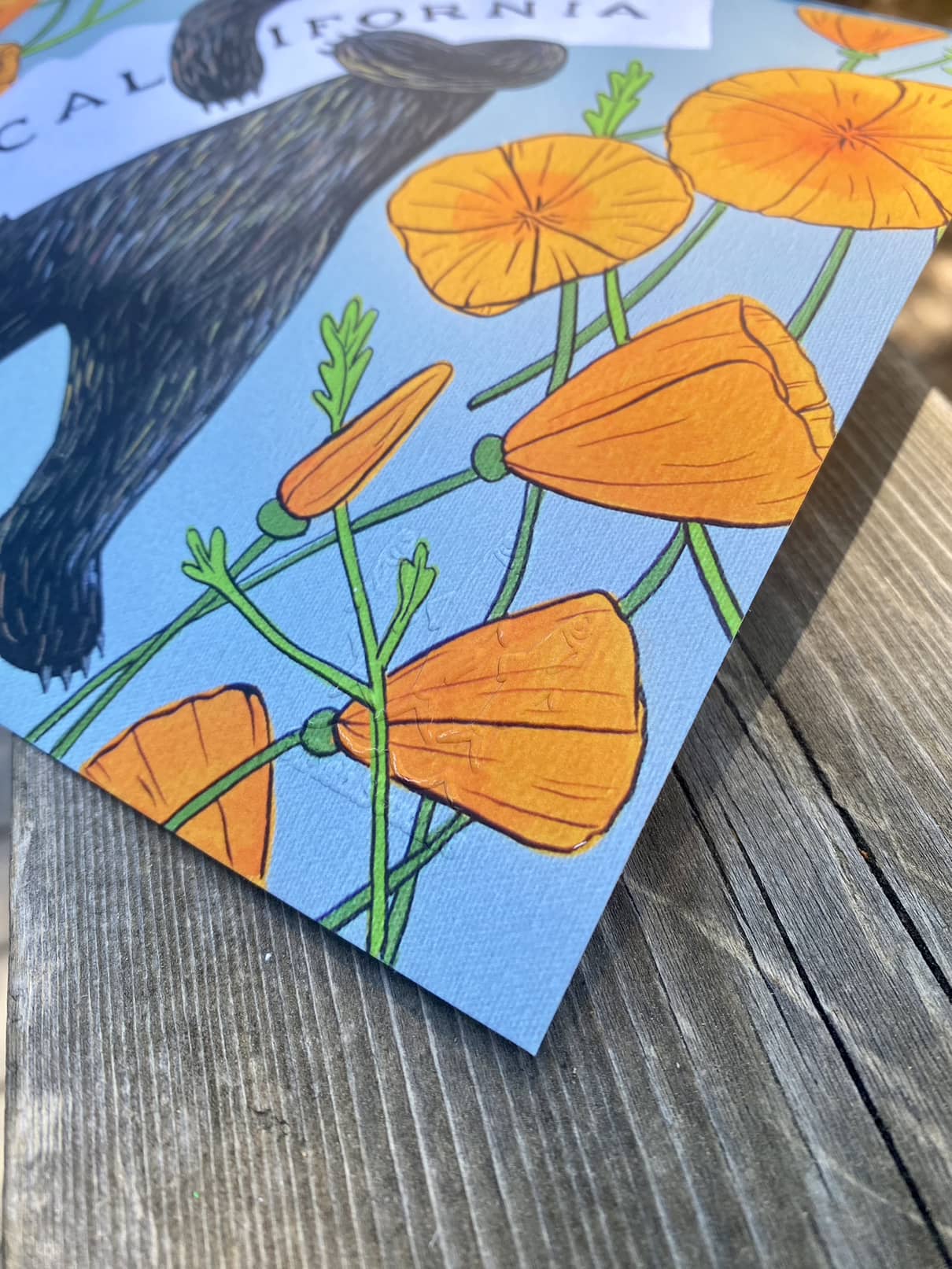 The Golden State shines even brighter when it’s awash in California poppies. Our Poppy Print, adapted from Annie’s original painting, captures the spirit of California in all its vivid beauty. The bear, a symbol of the state’s wild heart, stands among a field of brilliant poppies—celebrating resilience, color, and the natural treasures of this place we love.
